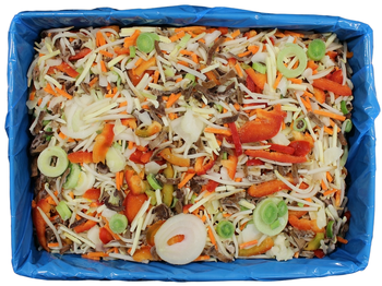 Склад: паростки квасолі Мунг, морква, червоний перець, Китайські гриби, цибуля, цибуля–порей, пагони бамбука, білокачанна капуста.